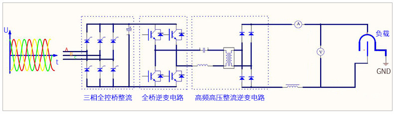 (1)好值靓电浆电源,由三相交流电输入,整流后,经IGBT逆变,成为高频脉冲交流电,经高频高压变压器升压,再整流输出高频高压脉冲直流电。
